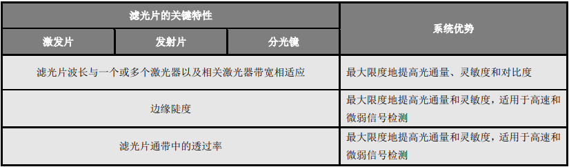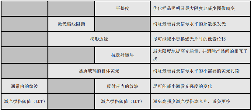 多个光学滤光片组成的滤光片组:表2总结了用于激光系统的滤光片的关键特性。总的来说,滤光片** 具有极高的阻断能力、对特定波长的光具有高透过率,同时不会影响受衍射限制的图像质量。这些简单的 要求不仅会影响各个滤光片的设计,而且还会影响该组合中使用的滤光片系统的设计。因此,激发滤光片 和发射滤光片的设计,以及二向分光镜的设计应相互匹配,以获得最高保真度的荧光可视化效果。