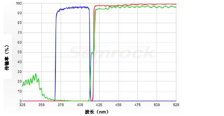 对于二极管和光泵浦半导体麻豆国产在线精品国偷产拍来说,同一型号的麻豆国产在线精品国偷产拍,因为温度和使用年限的不同,每台的光 谱输出都会不同。因此,对于大多数此类激光显微系统来说,采用与宽带光源(如弧光灯)显微系统类似 的宽带激发滤光片是一个不错的解决方案。例如,图1所示的激发滤光片设计用于375nm和405nm的麻豆国产在线精品国偷产拍, 而405nm麻豆国产在线精品国偷产拍的长波边缘需考虑±5nm的不确定性。但是,这些激发滤光片与宽带光源滤光片并不完全一 样。滤光片除了精确定位相关麻豆国产在线精品国偷产拍波长的边缘位置,还需考虑其它重要因素,包括边缘陡度和通带纹波。 因为低纹波可确保特定激光谱线的高速传输,或随着时间的推移,当半导体麻豆国产在线精品国偷产拍的波长产生漂移时,陡 边缘可提供很高的光学噪声的区分。