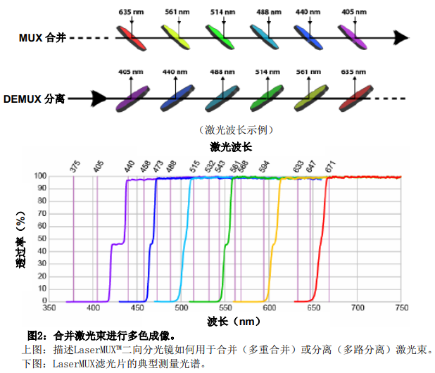 样本采用多个荧光基团进行标记,这些荧光基团需在特定条件下才能清楚地看到。因此,就有必要合 并多个激光束(多重合并,或简称为 MUX)或分离某一复合激光束。相对于只用于成像的二向色镜,用于 此类应用的二向分光镜合并/分离具有独特的要求。Semrock 的 LaserMUX™光束合成器(图 2)提供高透过 率(透过率 R 大于 95%),以及对重要激光谱线的极优的反射性能(反射率 R 大于 98%),从而实现损 失的最小化。