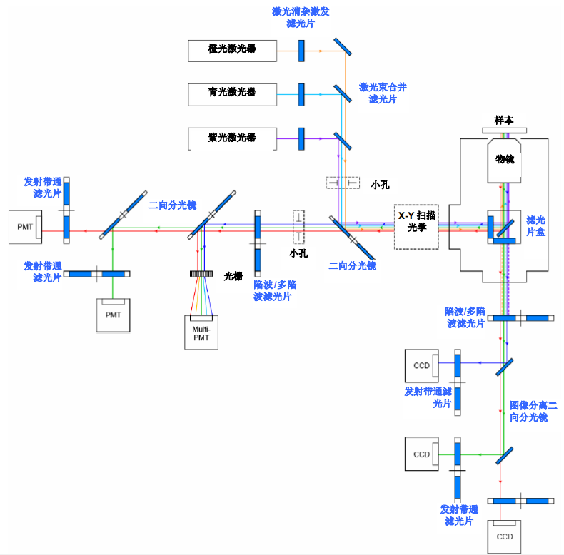图4中显示了可用于多种不同类型成像应用的多激光系统示例。突出显示的是不同类型的光学滤光片。 在该示例中,结合了三个麻豆国产在线精品国偷产拍,且该系统演示了通过退扫描和非退扫描探测路径的共焦扫描,各路径均 可实现同时多颜色探测。或者,如果没有扫描功能,可与兼容TIRF的物镜一起使用,进行TIRF成像。