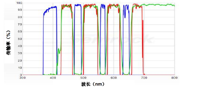 蓝色线 - 激发滤光片;绿色线 - 分色滤光片;红色线 - 发射滤光片