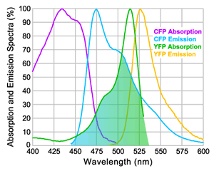 图 1:CFP(供体)和 YFP(受体)吸收和发射光谱。