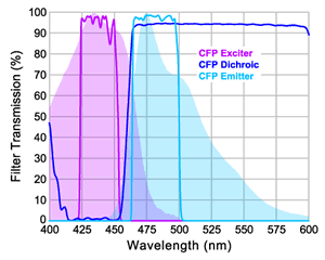 图 2:用于定量测量供体发射的 CFP 激发片、二向色和发射片(来自 BrightLine FRET-CFP/YFP-A 滤光片组)