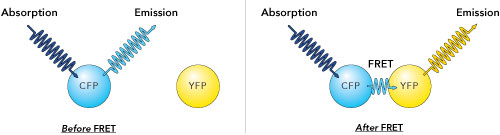 荧光共振能量转移 (FRET) 是一种在分子尺度上表征距离相关相互作用的强大技术。它是为数不多的能够测量体内和体外分子间和分子内距离相互作用的工具之一. FRET 涉及通过其吸收光谱内的入射光激发供体荧光团。这种辐射吸收将供体荧光团提升到更高能量的激发态,该激发态通常会以特征发射光谱辐射衰减(返回基态)。如果另一个荧光团分子(受体)存在于供体附近,其能量状态的特征是吸收光谱与供体的发射光谱重叠,则供体和受体之间存在非辐射能量转移的可能性。图1显示了青色荧光蛋白(CFP)发射光谱和黄色荧光蛋白(YFP)吸收光谱的重叠;这对支持强大的 FRET 相互作用。
