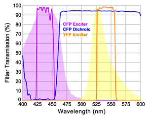 图 3:带有 YFP 发射滤光片(来自 BrightLine FRET-CFP/YFP-A 滤光片组)的CFP 激发片和二向色滤光片,用于受体发射的定量测量。