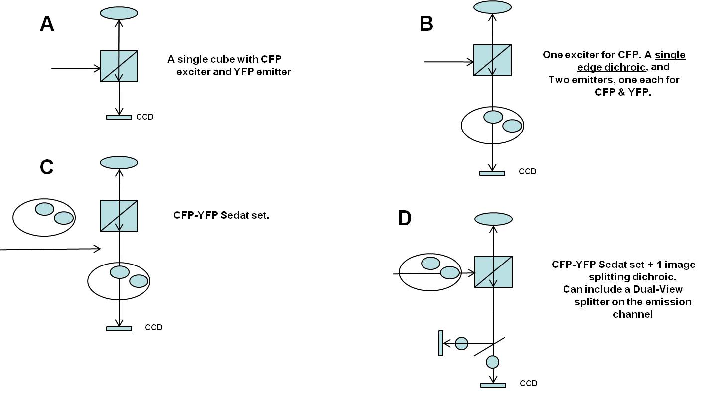 使用发射滤光轮可以实现快速、低振动的滤光片更换。这是用于宽视场 FRET 测量的最常见的显微镜配置。一些研究人员更喜欢使用双滤光片转轮系统(一个用于激发片,一个用于发射片)的灵活性,尽管这种系统在软件控制方面更昂贵且更复杂。对于双滤光片转轮系统,**的滤光片组选择是 Sedat 多波段组。最后,还可以使用两个摄像头同时检测供体和受体发射通道。一些制造商为此应用制造显微镜附件。除了标准的 FRET 滤光片组外,还需要一个额外的二向色分束镜来分隔附件中的两个发射路径。