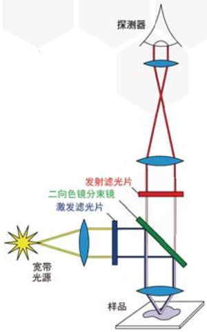一个典型的系统有三个基本的滤光片组成:激发滤光片(或吸收滤光片),二向色镜分束镜(或二向分色镜)和发射滤光片(或阻挡滤光片)。激发滤光片通常是一个带通滤光片,它只透过荧光染料的吸收波长,从而**限度地减少荧光的其他来源的激发光和阻挡荧光发射带内的激发光。二向色镜分束镜是一种边缘滤光片,用于斜角入射 (通常是 45 °),以有效地反射激发波段的光和透射发射波段的光。Semrock 发射滤光片通常是一个带通滤光片,仅透过荧光染料的发射波长,并阻挡这个波段之外的所有不需要的光 - 尤其是激发光。通过滤光片阻挡不需要的激发能量(包括紫外和红外)或样品和系统的自发荧光,就可以得到具有黑暗背景的荧光图像。