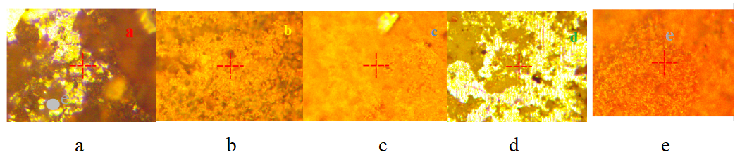 在钢板锈层上选择五个检测点位,实验样品编号为a、b、c、d、e,a点为黑色锈层,b、c、e分别为不同位置、不同颜色深浅的黄色锈层,d为白色锈层。分别对五个样品点位的锈层进行显微成像和拉曼检测。