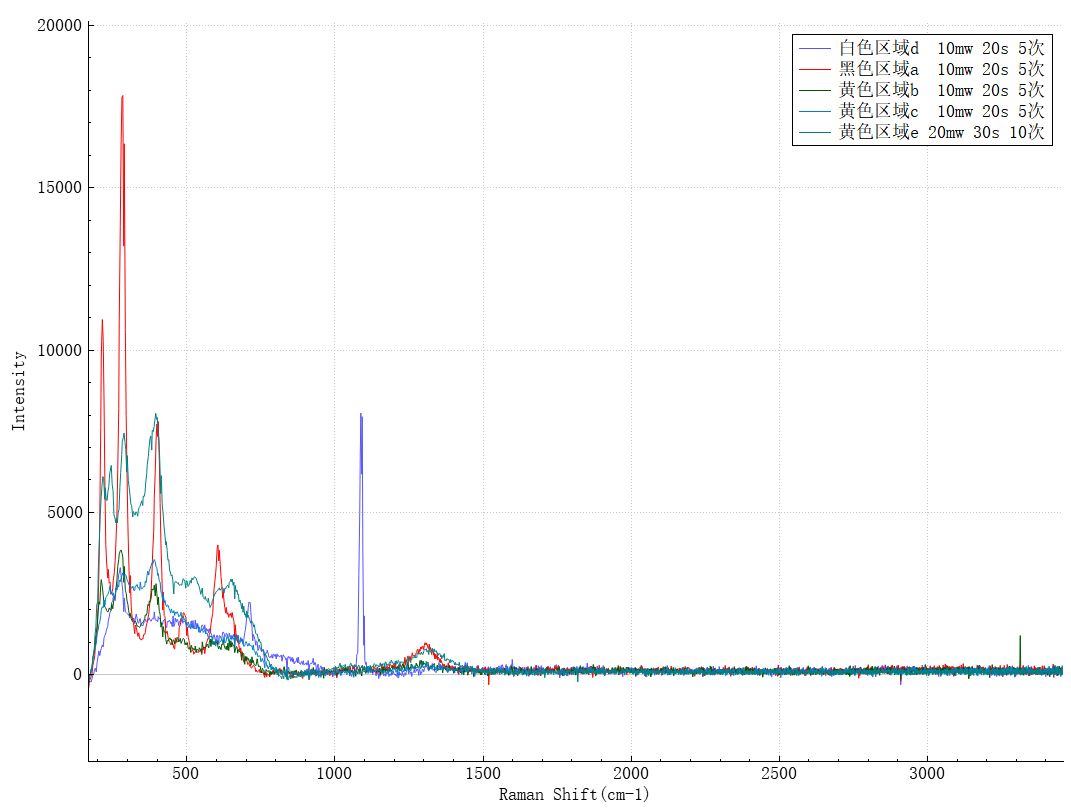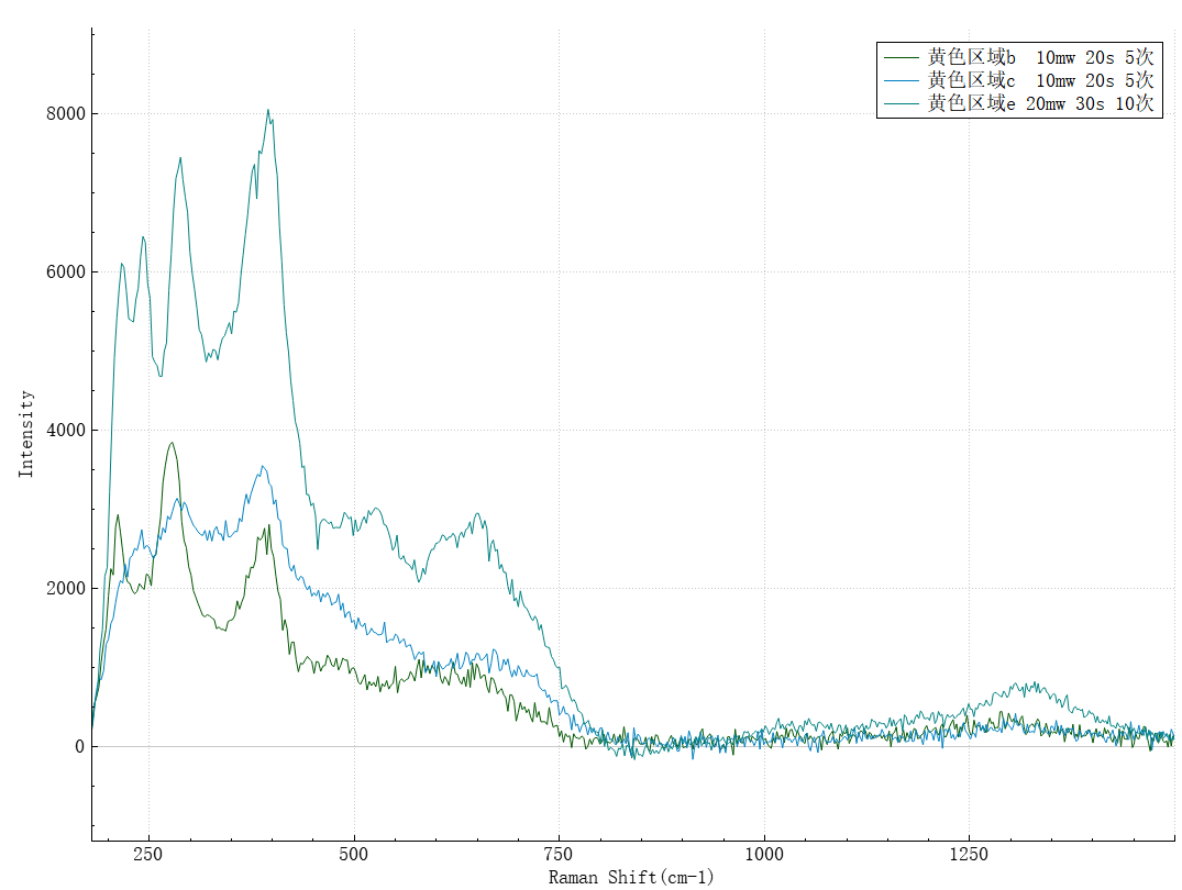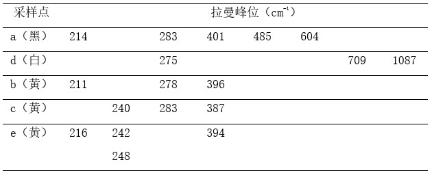 三个黄色区域采样点信号有所差异,b点在211cm-1、278cm-1、396cm-1有拉曼信号,c点在240cm-1、283cm-1、387cm-1处有拉曼信号,e点在216cm-1、242cm-1、248cm-1、394cm-1处有拉曼信号。