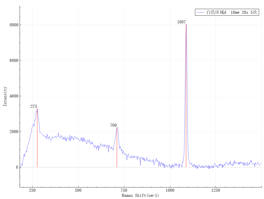 白色区域在275cm-1、709cm-1、1087cm-1处有明显的拉曼信号峰,其中709cm-1处和1087cm-1处拉曼峰位与其他颜色锈层信号区分度明显。