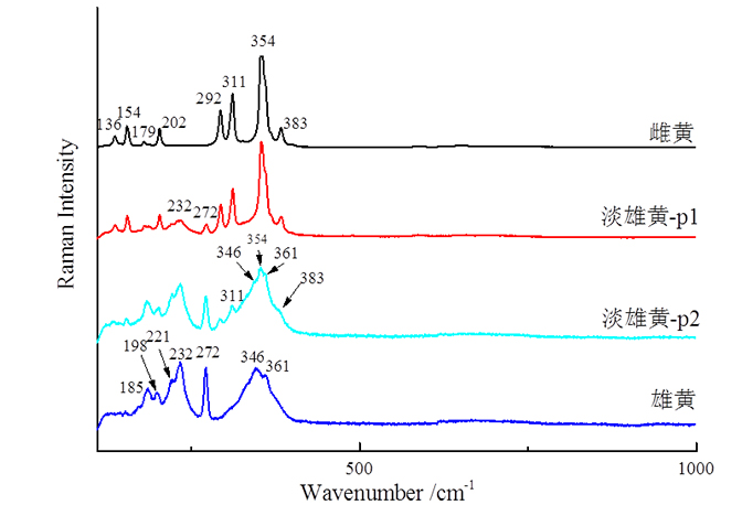 雄黄,雌黄和淡雄黄都是黄色颜料。同时也都是砷和硫元素组成的化合物或者混合物。拉曼光谱如图1-4所示,雌黄的拉曼峰在136,154,179,202,292,311,354和383 cm-1,这与文献上雌黄(As2S3)的拉曼峰是一致的。雄黄的拉曼峰在185,198,221,232,272,346和361 cm-1与文献中的雄黄(As4S4)拉曼峰也是对应的。这说明,扎西彩虹藏传颜料的雄黄和雌黄是高纯度矿物颜料。淡雄黄的拉曼峰在测量点P1和P2包含了雄黄和雌黄的拉曼峰,说明淡雄黄是雌黄和雄黄按照一定比例混合而成。