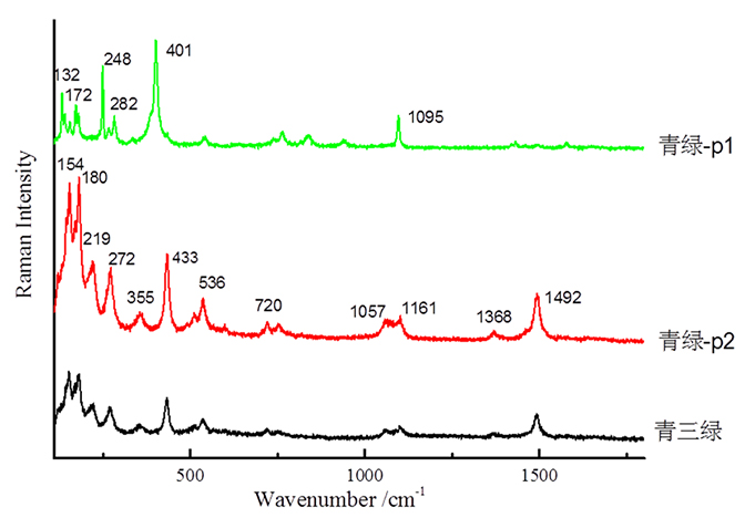 青绿颜色分为两种,青绿和青三绿。如图1-3所示,青绿颜料不同位置给出两种不同的拉曼光谱,分别是青绿p1对应于石青,p2对应于石绿,这说明青绿是由石青和石绿的混合而成。青三绿的拉曼峰与石绿吻合,说明青三绿的主要成分是石绿。青绿和青三绿虽然带有青绿二字,而其实际的成分和色彩相差较多,青绿是介于青色和绿色之间的颜色,而青三绿却是根据实际的色彩定义的绿色颜料名字。XRD分析同样给出两种组分的物相结构,分别是石青和石绿。EDS分析只能给出铜、碳、氧三种元素,不能够准确的鉴定青绿颜料的组分结构。但是拉曼谱和XRD能够准确的给出青绿的物相结构。