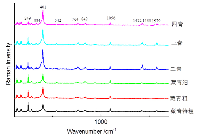 如图1-1所示,蓝色颜料分为六种,其拉曼光谱峰位均在249,334,401,542,764,842,1096,1422,1433和1579 cm-1 ,这与矿物颜料石青(2CuCO3·Cu(OH)2)的拉曼光谱完全吻合,说明蓝色颜料均为石青。但是六种颜料颜色不一样,拉曼光谱一致,根据扫面电镜图像分析,可知这几种颜料是依据颗粒度不同对应的色彩进行分类的。EDS分析说明里面含有铜、碳、氧元素,说明蓝色颜料是含铜、碳和氧的化合物,根据蓝色颜料所包含的元素种类,确定其为石青。同样,蓝色颜料的XRD分析结果表明其物相结构主要为石青的物相结构。这些分析结果与拉曼谱分析结果一致,相互验证,相互辅助,准确的界定蓝色颜料的物相结构。