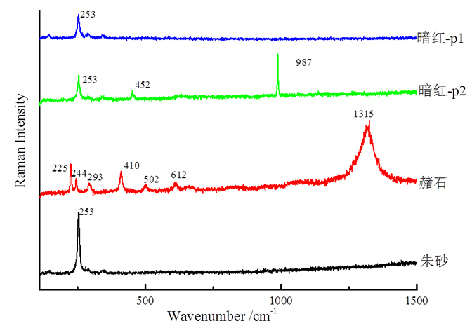 红色颜料包含暗红,赭石和朱砂三种。根据拉曼光谱分析,发现暗红颜料的拉曼峰在253,452,987 cm-1(图1-5 P1和P2),其中253 cm-1是属于朱砂(HgS)的谱,而452和987 cm-1是属于重晶石(BaSO4)的谱,说明暗红颜料是朱砂和重晶石按照一定的比例混合而成。赭石的拉曼峰在225, 244, 293, 410, 502, 612, 1315 cm-1处(图1-5),这与文献中的赭石(Fe2O3)拉曼峰位置相同,说明赭石的主要成分为Fe2O3。朱砂的拉曼峰在253 cm-1,其成分为HgS,是古代常用的红色颜料之一。红色颜料的XRD和EDS分析与拉曼谱分析结果一致。