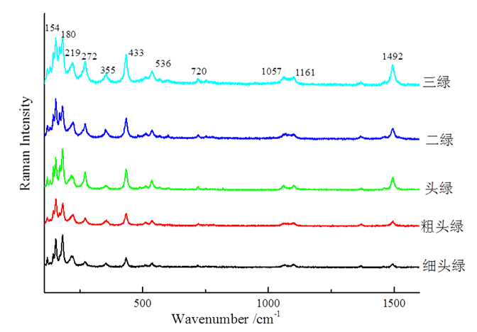 绿色颜料有五种,拉曼光谱如图1-2所示,绿色颜料的峰位均在154,180,219,272,355,433,436,720,1057,1161和1492 cm-1,与石绿(CuCO3·Cu(OH)2)的拉曼峰位一致,说明绿色颜料都是石绿。五种绿色颜料的分类与蓝色相似,同样根据扫面电镜分析,这几种绿色颜料也是依据颗粒度不同对应的色彩进行分类的。拉曼谱分析结果与XRD结果一致。EDS分析说明绿色颜料含有铜、碳、氧三种元素,而含有这三种元素的绿色颜料主要有两种,石绿和氯铜矿,鉴于EDS分析中没有氯元素的存在,确定绿色颜料为石绿。