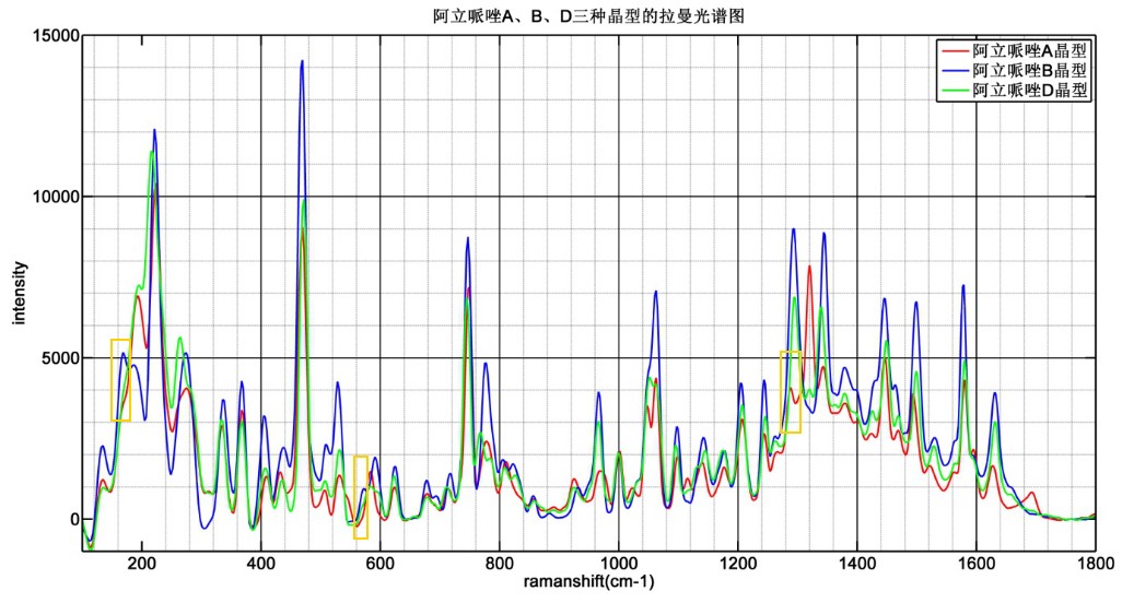 图 3:阿立哌唑A、B、D三种晶型的拉曼光谱图