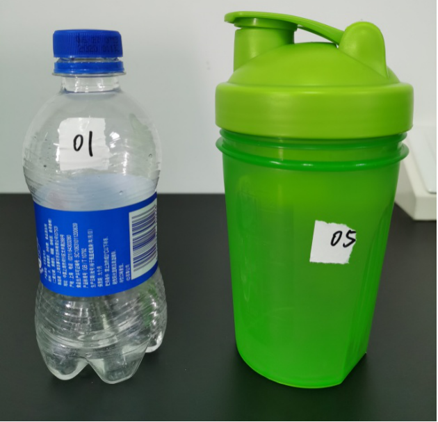 搜集市面上的水瓶水杯,瓶子底部标有不同的回收标识:样品1瓶底的标识为<01>,样品2瓶底的标识为<05>,分别代表PET和PP材质。
