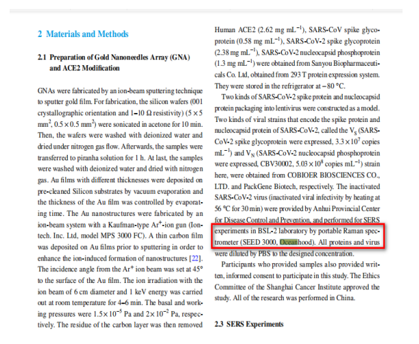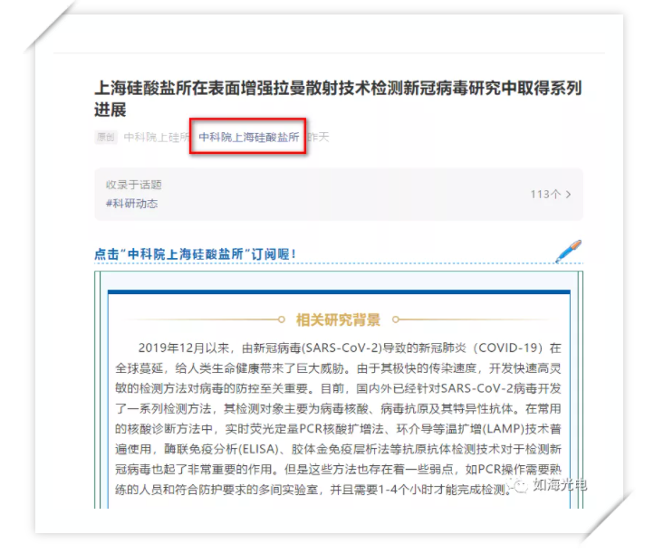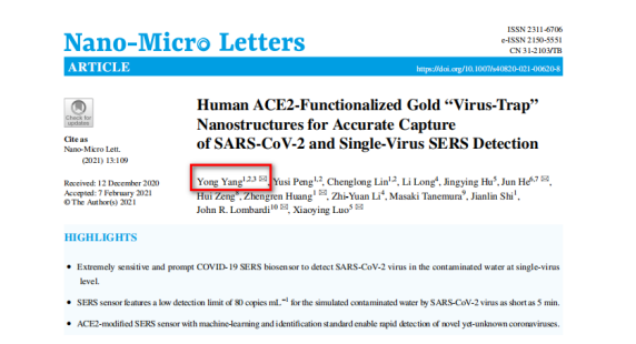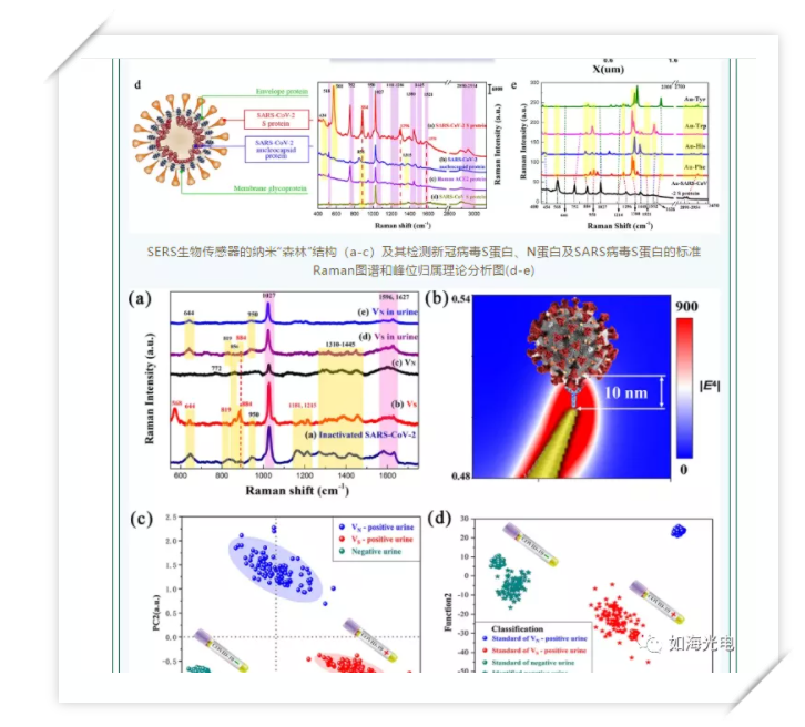 最近,中国科学院上海硅酸盐研究所黄政仁团队杨勇研究员与安徽省疾病预防控制中心、上海交通大学仁济医院、华南理工大学及美国纽约市立学院科研人员合作,联合开发了一种新冠病毒表面增强拉曼散射(SERS)传感器及检测技术,成功检测出新冠病毒,并在国内顶级期刊——Nano-Micro Letters(Nano-Micro Letters刊登的文章专注于纳米或微结构和系统在物理、化学、生物、材料科学中的科学、实验、工程、技术和应用的原创文章)发表了第一篇用小拉曼测出新冠病毒的文章。