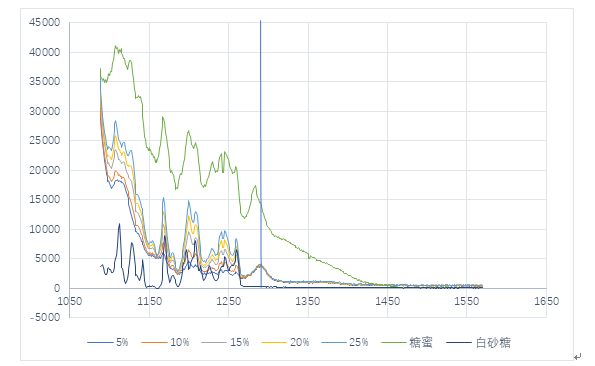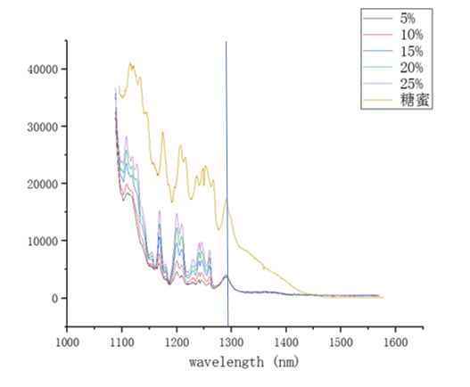 由图可看出,有许多清晰的糖的谱峰,且1291.935nm(图中标蓝)处可见水的谱峰。糖蜜可看出明显的谱峰,但可能由于荧光的影响,使得糖蜜的谱峰较之白砂糖和糖溶液有一定的偏移。