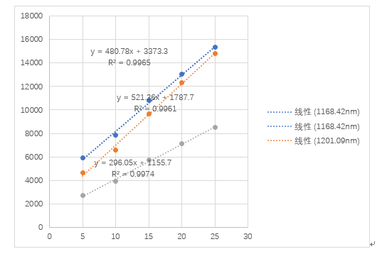 在五种不同浓度的溶液中,选取较为明显的1168.42nm,1201.09nm,1260.21nm三个峰(如图所示),以浓度为x,峰强为y,对各处的峰进行线性拟合,发现浓度与峰强存在线性相关。