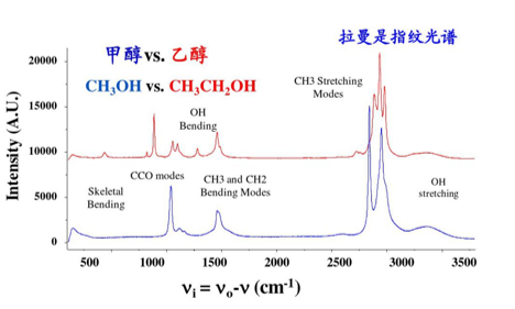 拉曼光谱(Raman spectra)是一种散射光谱,能够反映分子的振动和转动信息,每种物质的拉曼光谱图都不一样,可以通过拉曼光谱图分辨不同物质,从而帮助研究人员分析待测物质分子结构,对物质进行定性。如,通过拉曼光谱可以简单、快速、准确的分辨甲醇和乙醇
