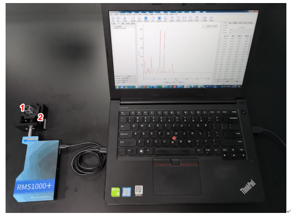 4、待样品提取后,放入比色皿(1)中和液体支架(2)上,就可以用RMS1000开始检测了。