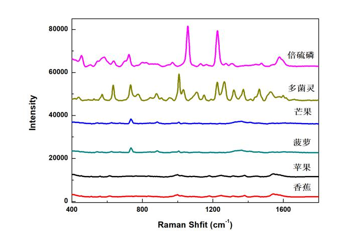 由图可以看出,最上面两条是倍硫磷、多菌灵标准品的拉曼光谱线,倍硫磷和多菌灵均具有多个拉曼特征位移。在超市购买的苹果、香蕉、芒果、菠萝测试图谱中未发现这两种农药的特征峰谱。