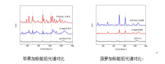 从图中可以看出,在苹果和菠萝中分别加入0.5ppm的农药后可以明显观察到多菌灵和倍硫磷拉曼特征位移,在较低的添加浓度下,两种农药拉曼特征位移依然清晰可辨。