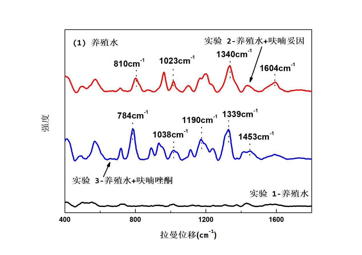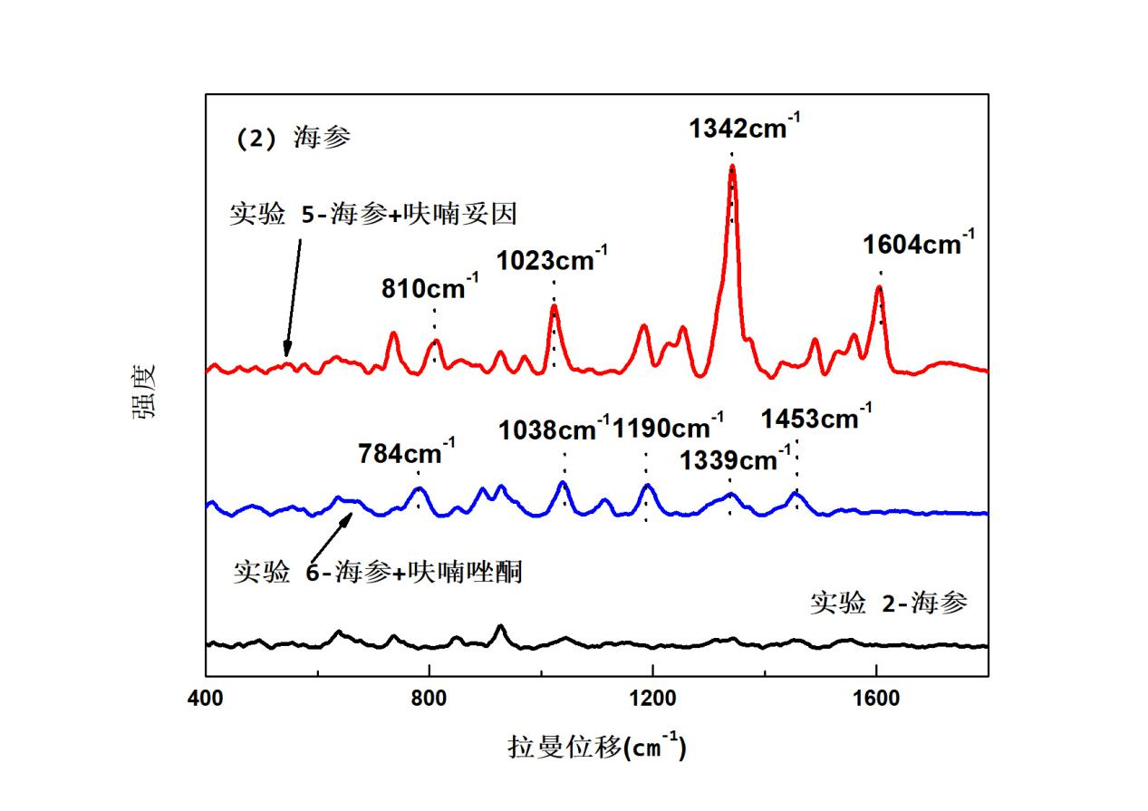 实验5和6分别是在海参中添加了呋喃唑酮和呋喃妥因的测试结果,与养殖水测试结果类似的,两种药物在海参中也可以通过拉曼光谱法检出。
