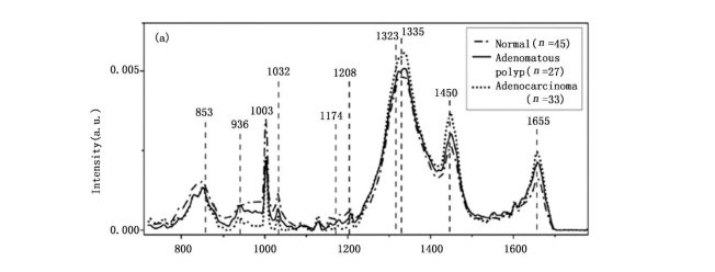 胃癌是目前第四大常见的恶性肿瘤,也是全球癌症死亡的第二大病因,得不到早期的发现与及时治疗是胃癌高死亡率的主要原因。腺瘤性息肉有明显恶变为腺癌的潜力,属于病变中组织,如果对其可以早期发现并切除可以较低胃癌的发病率。但是通过胃镜下肉眼观察仍然存在一定困难,拉曼光谱具有非侵入性、快速、灵敏等优点,特别在使用近红外激发光下可以更深的穿透组织进行检测。