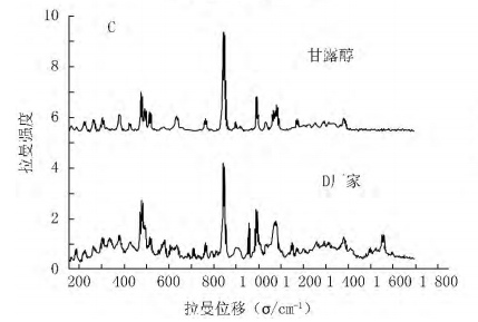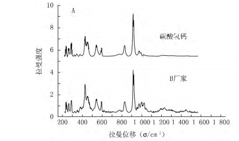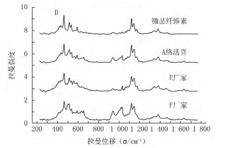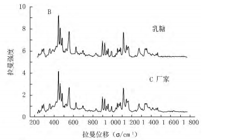 Raman spectra show that B, C, D Raman spectra are very different from the original drug. The main components are calcium bicarbonate, lactose and mannitol, which are not the main components of the original drug. It can be seen that the Raman spectrum can be used to identify the drugs rapidly and accurately.