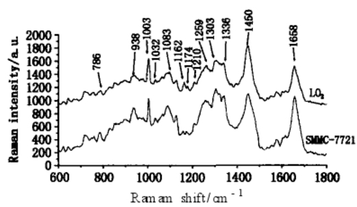 It can be seen that there is a significant difference between normal hepatocytes and hepatocellular carcinoma cells, the overall spectral line intensity is weakened, and there are also significant changes in some characteristic peaks. The liver cancer cells can be determined.